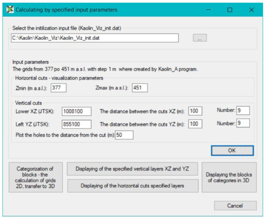 The program Kaolin_A limits 3D grids of the bottom and the top of the kaolin deposit with the help of the “Math” object. Moreover, the “Math” object exports (if the “Export 2D grids” button is checked—see Figure 8) 2D grids in the format grd (Surfer) of individual horizontal layers of all technological parameters to the directory specified in the initialization file for further processing by the program Kaolin_Viz.