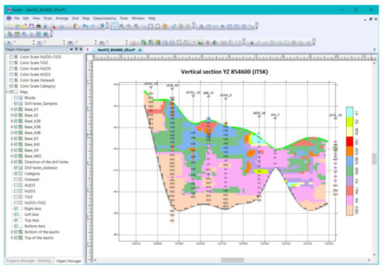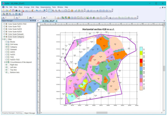 The second module of the program Kaolin_Viz performs the visualization of horizontal cuts in 2D in the Surfer environment (button “Displaying of the horizontal cuts specified layers”). Before starting, it is possible to enter the values Zmin and Zmax (both in meters above sea level) of the layers to be processed in the frame “Horizontal cuts—visualization parameters” (Figure 16) and then confirm these values by pressing the button “OK”. Figure 19 shows a visualization of one of the 85 horizontal cuts generated in the Surfer environment.