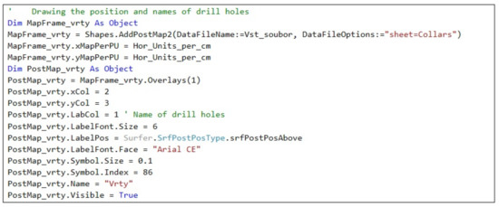 The following example contains a part of VB.NET code (Figure 23) with the Surfer automation model to visualize horizontal cuts of the kaolin deposit, specifically by plotting positions and names of drill holes.