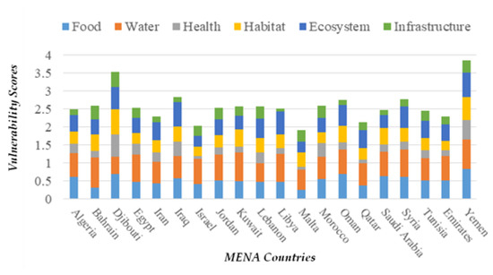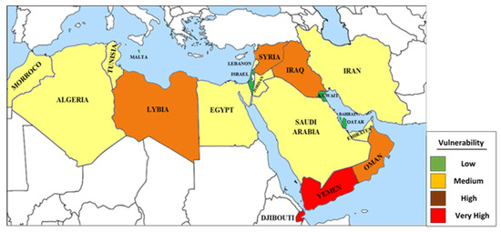 As indicated in Table 2, the low vulnerable countries, i.e., Bahrain, Kuwait, Malta, Qatar and Israel, have the lowest level of food, human habitat and ecosystem services vulnerability. Moreover, Table 2 declares that the medium vulnerable group, which is consisted of most MENA countries (i.e., Tunisia, Saudi Arabia, Morocco, Lebanon, Jordan, Iran, Emirates, Egypt and Algeria) shows a moderate degree of food, water and ecosystem services vulnerability and a low level of human habitat, health and infrastructure vulnerability. On the other hand, the highly vulnerable countries including Syria, Oman, Iraq and Libyan are associated with a high extent of water and ecosystem services vulnerability, a moderate degree of food and health vulnerability and a low level of human habitat and infrastructure vulnerability (Table 2). The very high vulnerable countries including Djibouti and Yemen exhibit the highest extent of food, human habitat, ecosystem services, health and infrastructure vulnerability (Table 2). The overall vulnerability of the MENA countries is shown in Figure 3.