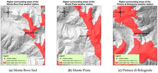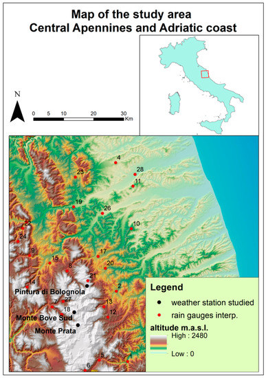 Weather stations have historically been the first devices for the collection of climatic data on the ground and are still among the most reliable for most of the world. The weather stations that were taken into consideration for this research were: Monte Bove Sud, 13.19 E 42.91 N (1917 m.a.s.l.), Monte Prata, 13.21 E 42.87 N (1816 m.a.s.l.) and Pintura di Bolognola, 13.23 E 42.99 N (1360 m.a.s.l.) (Figure 1). The data from these three weather stations were obtained from the Regional Weather-Hydro-Pluviometric Information System of the Civil Protection of the Marche Region. The data from the above weather stations have a daily step and were collected from 2010 to 2020, as earlier data were not available. From these weather stations, data on precipitation, prevailing wind direction, wind speed and ground snow level were extracted because they could be useful for assessing possible problems in precipitation amounts related to other climatic variables. In addition, data from other rain gauges, 27 in total, (Figure 1) close to the three mountain weather stations under investigation were collected from the above-mentioned Institution’s database in order to obtain interpolations of rainfall in the area [1,19]. All weather stations have undergone a thorough data quality control process [20].