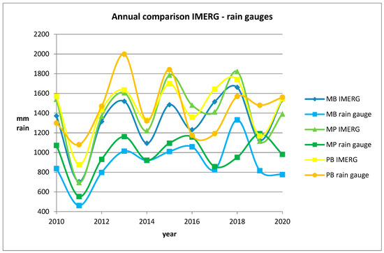 First of all, from a graphical point of view, the annual data were analysed, which tended to show for the two weather stations at higher altitude (MB and MP) lower rainfall values than IMERG (Figure 1). On the other hand, in the case of PB, rainfall and satellite data were in better agreement, with very similar years and years alternating between higher rainfall measured either by rain gauges or by satellites (Figure 2). In particular, there is substantial agreement in the fluctuations between rain gauges and satellite data, with few discrepancies, probably signifying systematic background underestimation (Figure 2).