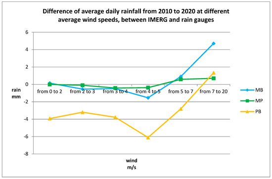 Table 4 shows the common behaviour of the investigated mountain rain gauges as a function of different wind speeds. In particular, it is possible to observe that the trend of the IMERG data compared to those of the rain gauges is very similar, more pronounced in the case of MB and PB and less pronounced for MP.