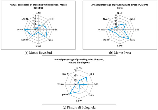 It can be observed from the graph (Figure 2) that in the range from 7 to 20 m/s wind speed, the IMERG precipitation data increases, while those of the rain gauges increase less or even decrease. The differences seem to be very well correlated between the various measuring points; in fact, the Pearson correlation coefficient shows the following values: MB–MP is equal to about 0.85; MB–PB is equal to about 0.96 and MP–PB is equal to about 0.81. Thus, it can be seen that the pattern of the variation between the IMERG data and the rain gauge data is very similar between the three weather stations. In order to better understand the differences affecting the investigated weather stations, wind was also taken into account by observing the annual distribution of wind in percentage.