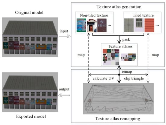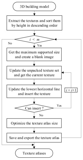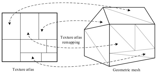 High-precision 3D urban models are an important source of data for smart city systems [1] which has been widely used in facility management, development planning, emergency decision making, and so on. As the 3D urban model from UAV oblique photography still has the disadvantages of structural adhesion, white holes, mesh distortions, and texture missing, a manual 3D model is still necessary [2,3]. The high-precision manual modeling method augments the reality of the scene at the cost of the rapid increase in the amount of data. Real-time rendering of a detailed 3D model is still a challenge for computer graphics [4]. As for a complex textured urban model, the amount of texture data is much larger than the geometric data [5]. It usually has dozens or hundreds of textures, which are characterized by large amounts but small individuals. Since each texture can be loaded and rendered very quickly, it is of little significance to simplify and compress a single texture, but for graphics processing unit (GPU) rendering, large quantities of small textures significantly increase the costs of loading and rendering batches, slowing down the rendering efficiency. Rendering a large-scale urban model scene directly is prone to slow model loading, untimely texture display, and rough roaming. Therefore, packing multiple textures into atlases for a 3D urban model can solve the rendering limitation.