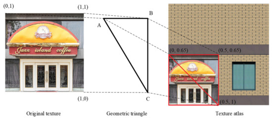 As all the textures of a building model are packed into one or more texture atlases, the texture atlases must be remapped onto the geometric mesh. The texture atlas remapping problem is calculating the new texture coordinates for each triangle mesh. Figure 4 shows the texture atlas remapping sketch map.
