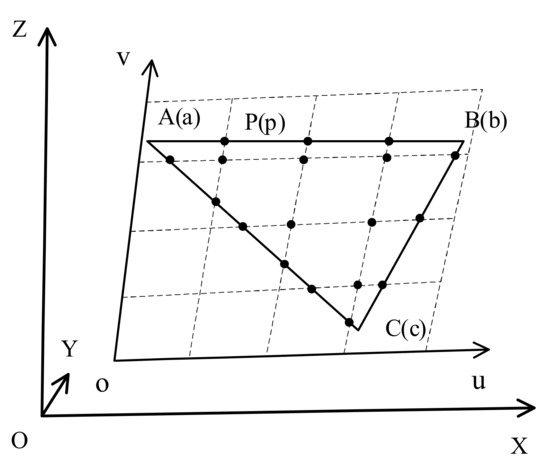 Figure 6 shows the method of clipping the geometric triangle using the unit rectangle. O-XYZ is the 3D global geometric Cartesian coordinate system, the triangle in the global coordinate system is ABC, and its vertex coordinates are (Xa, Ya, Za), (Xb, Yb, Zb), and (Xc, Yc, Zc). Meanwhile, o-uv is the 2D local texture coordinate system, the triangle in the local coordinate system is abc, and its texture coordinates are (ua, va), (ub, vb), and (uc, vc). The triangle is clipped into many unit triangles in the 2D texture coordinate system, and the geometric vertices of the unit triangles are calculated in the 3D Cartesian coordinate system. The specific steps of the triangle clipping algorithm include the following: