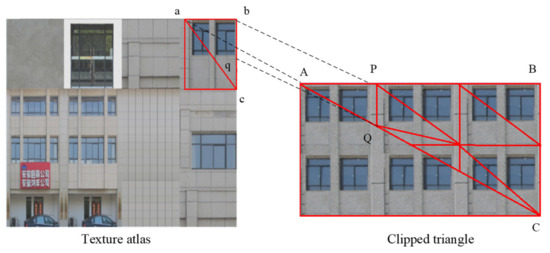 Since the texture coordinates and the geographic coordinates of vertex P and Q are acquired, the new triangle APQ is built. Other new vertices and triangles can be constructed in the same manner. By clipping triangles and adding geometric vertices, the problem of repeated texture mapping is solved. The texture atlases are remapped in this manner.