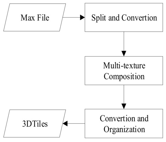 In order to efficiently load and render the massive high-precision building models, the files were processed and organized appropriately. The processing workflow is shown in Figure 8, the specific steps were as follows: