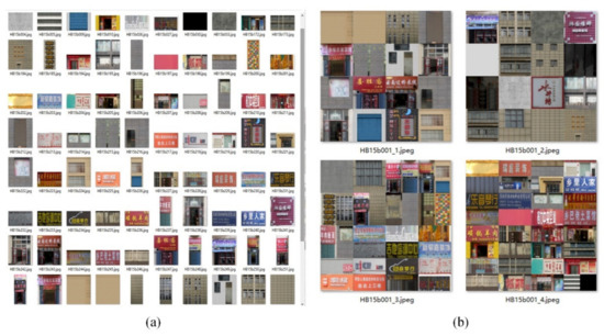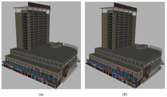 Figure 9 shows the textures of a building model before and after processing. Figure 9a shows 95 textures of the original model, including non-tiled textures and tiled textures. The maximum texture size was set to be 2048, so all the textures were packed into 4 texture atlases as shown in Figure 9b. The number of textures was significantly reduced by texture packing. The original geometric mesh is shown in Figure 10a, and it was clipped for texture atlas remapping as shown in Figure 10b. Through the comparison, it can be seen that the number of geometric vertices increased after the texture remapping. Figure 11a is the visual effect of the original model, and Figure 11b is the visual effect of the processed model. Compared with the original model, the visual accuracy of the texture-packed model was almost the same.