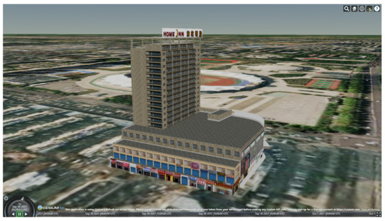 The texture-packed building model was loaded and visualized in Cesium as shown in Figure 12. It can be seen from the figure that the rendering effect of the model after texture processing was good. The visual repeated line effect did not exist on the 3D building model’s surface. The visual effect of the texture-packed model met the actual demand. This shows that the method in this paper can achieve texture packing and remapping for 3D urban building models.