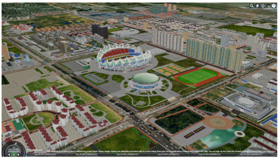 Since a single building model file size is relatively small, the large-scale urban scene was tested for its rendering frame rate. All the building models were processed and organized into 3D Tiles format by a quadtree index, which was loaded in Cesium as shown in Figure 13. Compared with the original urban scene, the texture-packed urban scene was loaded and rendered faster. The reasons for this include two points: (1) the building model was packed with fewer textures, which decreased the texture loading and rendering batches, and (2) the file size of the processed model was smaller, which decreased the loading time. When comparing the rendering smoothness of the urban scene, the rendering of the original 3D scene was not smooth, while the rendering FPS of the processed urban scene was above 30, which is relatively smooth. Through the processing method in this article, the rendering effect of a large-scale urban model was realistic, and the rendering result was smooth.
