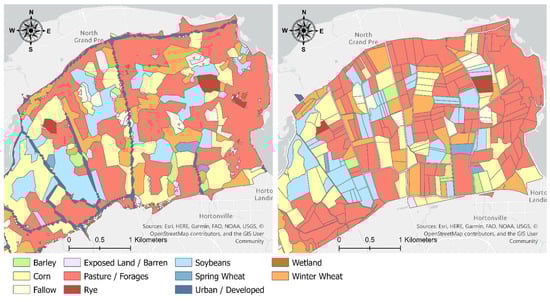 To assign a land use to the property boundaries, the Annual Crop Inventory raster layers were clipped to the edges of the marsh bodies. Here, the zonal statistics tool within ArcGIS Pro (ESRI, Redlands, CA, USA) was used to identify the dominant crop type from the crop inventory within each property boundary polygon (Figure 3). This approach allowed each property unit within the NSPRD to be assigned a crop type within the marsh bodies, thus enabling the possibility of estimating the number of hectares of crops produced each year. All of the fields that were not assigned a class were removed from the database. Additionally, all the water, road, and rail polygon segments were selected and removed from the dataset. The filtering process provided a stronger characterization of the crops grown on the dykelands by eliminating non-agricultural fields that could compromise the rest of the analysis.