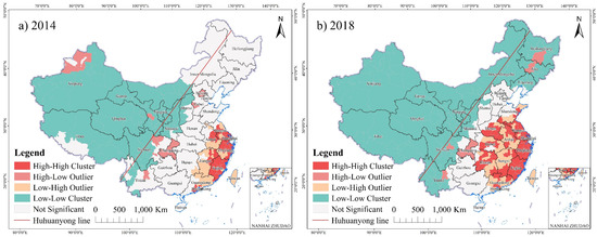 Spatial clusters of cyber fraud cases in China for (a) 2014 and (b) 2018. See Figure S2 (Supplementary Materials) for other years.
