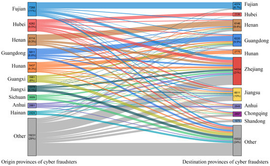 A Sankey diagram was then plotted to reveal the cross-regional flow of cyber fraud offenders in China. As can be seen from Figure 2, Fujian, Hubei, Henan, Guangdong, and Hunan are the major origin provinces of cyber fraudsters, which account for 46.9% of the total fraudsters nationwide; Zhejiang, Jiangsu, Guangdong, Henan, and Fujian are the major destination of cyber fraudsters, contributing 56.6% of the total. For different destination provinces, the distribution patterns of origin places of cyber fraudsters are very different from each other. Overall, the cyber fraudsters in Zhejiang and Jiangsu Provinces are mainly from outside the provinces, while the cyber fraudsters in Guangdong, Henan, Anhui, Hunan, and Hubei Provinces are mainly from local provinces. To be specific, the cyber fraudsters flow into Zhejiang are mainly from Fujian (12.5%), Hubei (10.6%), Henan (7.2%), Hunan (6.6%), Guangdong (6.1%), and Jiangxi (5.6%); cyber fraudsters in Jiangsu were mainly from Hubei (13.2%), Henan (9.2%), Jiangsu (8.8%), Jiangxi (6.2%), Guangdong (6.0%), and Guangxi (5.7%). The origin places of cyber fraudsters in Guangdong, Henan, and Anhui are relatively concentrated. The cyber fraudsters in Guangdong mainly come from local (38.3%) and neighboring provinces such as Guangxi (14.1%), Hunan (13.5%), and Fujian (6.8%), while those in Henan and Anhui are mainly from local (44.3% and 25.3%, respectively) and Hunan (8.5% and 8.7%, respectively), Hubei (7.3% and 12.6%, respectively), and Fujian (6.0% and 8.6%, respectively). The cyber fraudsters in Fujian, Hubei, and Hunan are mainly from local provinces (75.6%, 63.5%, and 64.7%, respectively). A more detailed table that shows the flow of offenders to major destination provinces is provided in Table S1 (Supplementary Materials).