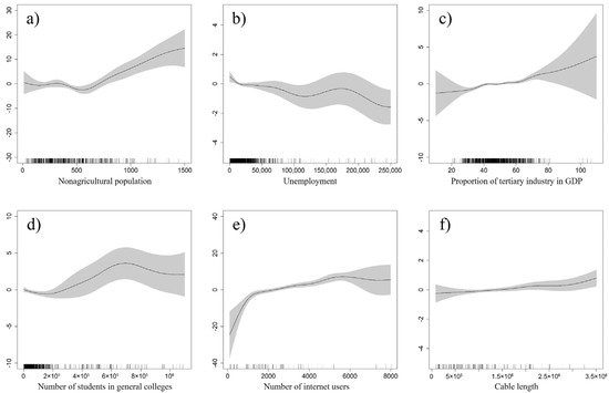 The partial effects of the six statistically significant variables on cyber fraud are shown in Figure 3. Each variable shows a clear nonlinear relationship with cyber fraud. The number of cyber fraud cases showed a slight decrease when the nonagricultural population was less than 5 million; when the population was more than 5 million, the number of crime cases showed steady growth. The number of cyber fraud cases was negatively correlated with the unemployment, while it showed an approximate positive correlation with the proportion of tertiary industry in GDP, and when the proportion rose above 60%, the statistical confidence decreased. There was no significant change when the number of students in general colleges was less than 200 thousand, and a continuous increase was observed when the number of students was between 200 thousand and 650 thousand, followed by a modest drop. There was a strong positive relationship between the number of cyber fraud cases and the number of internet users, and an obvious inflection point was observed at approximately 10 million internet users, namely, when the number of internet users was more than 10 million, the number of cyber fraud cases increased slower. The number of cyber fraud cases showed a slight upward trend with the increase of cable length.