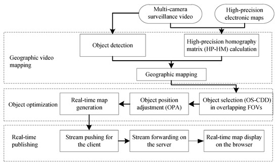 In this paper, we propose a new method of real-time web map construction based on multiple cameras and GIS (named RTWM-HP), which takes into account the object height and camera posture. The RTWM-HP method involves three main steps. The first step is geographic video mapping. The high-precision homography matrices (named HP-HM) between multiple cameras and a 2D map are calculated. Through an object detection model, the type and minimum bounding rectangle (MBR) of each object are extracted. The pixel coordinate of each object is converted into the corresponding geographic coordinate. The methods of the HP-HM calculation, object detection, and geographic mapping are depicted in Section 3.1. The second step is object optimization. Based on geographic video mapping, we perform object selection in an overlapping FOV (named OS-CDD). Furthermore, in order to achieve better map visualization, the objects’ positions in the map must be adjusted (named OPA). The method of object optimization and location adjustment is discussed in Section 3.2. The third step is real-time publishing. In order to better integrate with other systems or meet the needs of internet access, this paper designs a mixed-software architecture of C/S and B/S. The functions mainly include the pushing and forwarding of real-time object streams. Section 3.3 introduces the implementation process of the real-time map. The proposed workflow is shown in Figure 1.
