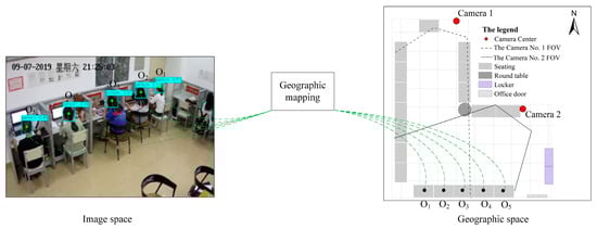 Geographical mapping refers to mapping of an object in an image space to a geographic space through a homography matrix. In this paper, based on the object detection models and the HP-HM calculation of each camera, the objects of each camera can be mapped to geographic space. As shown in Figure 3, in the left image, based on Headmodel, five human head objects (O1 to O5) were detected, and we could obtain the center point of each object MBR. Then, through the HP-HM of camera 2, these objects could be mapped to the map.