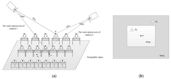 Dis: The distance between P and C; P represents the location of the object in geographic space, which is obtained from the pixel coordinates of the object in the image space after homography transformation. As shown in Figure 4a, for the object at position P, the distances from the two cameras are PC1 and PC2, respectively. Dis is calculated through Equation (2).