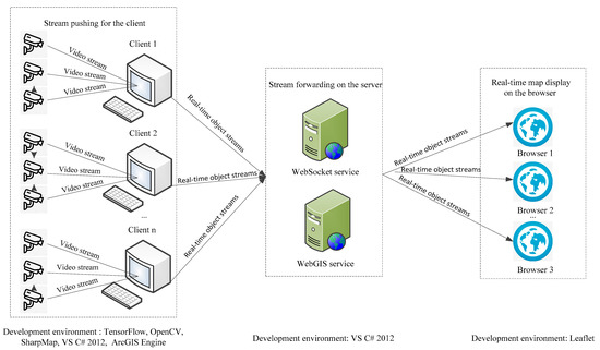Currently, real-time map data from multiple cameras are mostly displayed by standalone or client-based software, which greatly limits their application [57]. This paper provides a real-time map service based on multiples cameras that includes the type, location, and time information of the objects. The service is open, in real time, and easily integrated with WebGIS. At the same time, due to the demand for real-time access to object stream data through the internet, a new software architecture was designed, mainly including stream pushing for the client, stream forwarding on the server, and real-time map display on the browser, as shown in Figure 6.