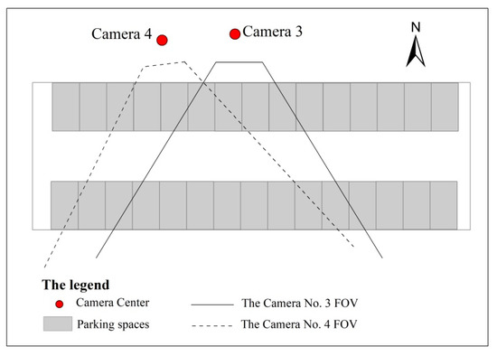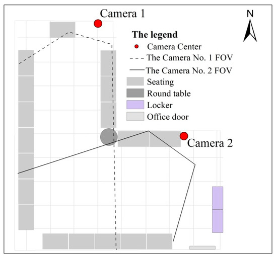 In the case study, TensorFlow, OpenCV, SharpMap, VS C# 2012, ArcGIS Engine, etc. were used, and we developed a real-time web map system based on multiple cameras and GIS. The computer environment of the object detection model training included a CPU (Intel Core i5 6300HQ) and GPU (GTX-1060 with 8G). In this paper, we selected an office and a parking lot as the experimental area, as shown in Figure 7 and Figure 8. We deployed two cameras with an overlapping FOV in an office and a parking lot, respectively. The corresponding electronic maps of the two regions were made. At the same time, we collected head samples in the office, including 7333 back-view and 67,324 front-view samples, which included an open dataset [58]. At the same time, we collected 8500 car samples in the parking lot.