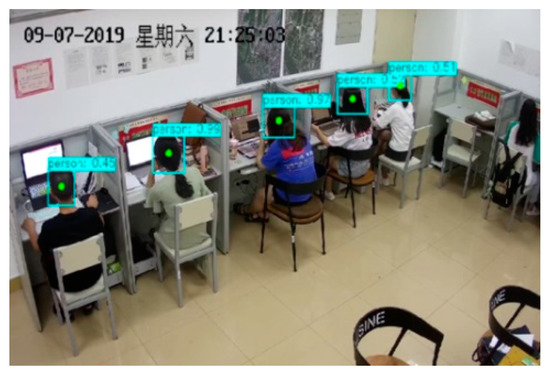 A TensorFlow Object Detection API pre-training model was used to train the human head and car sample data in the two scenarios. For example, for the office scene, the human head samples were divided into a training set and test set according to a ratio of 4:1. The training time was 545 min with 15,260 steps, and the training accuracy was 97%. The object detection effect in the office experimental area is shown in Figure 9, where the head objects are displayed with rectangles, and the number in the upper-right corner represents the degree of confidence.