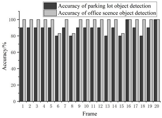 The actual test was carried out for two experimental scenes. One frame was extracted every minute—20 frames were extracted in total, and the frame numbers started from 1. The results shown in Figure 10 are the object detection accuracies of the office and parking lot scenes. The lowest object detection accuracies for the office and parking lot were 83.33% and 80%, and the highest were both 100%.