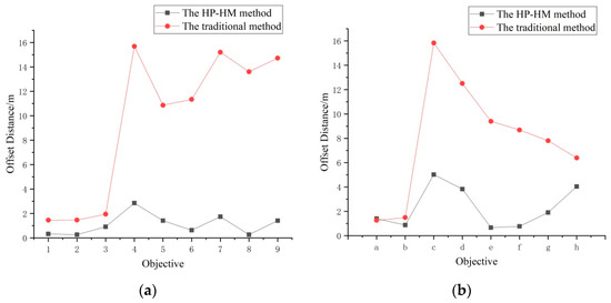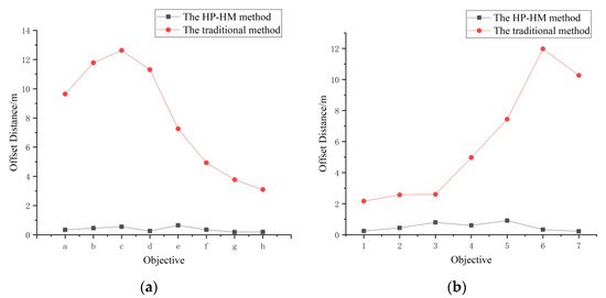 As shown in Figure 11 and Figure 12, for the office scene, the offsets of the object geographic coordinates calculated by the HP-HM method were all less than 1 m, and in the parking lot experimental area, the geographic coordinate offsets calculated by the HP-HM method were all less than 6 m. The geographic coordinate offsets calculated by the traditional homography matrix method were larger, and the maximum was 15.83 m.
