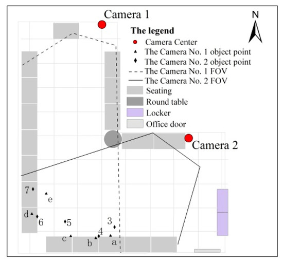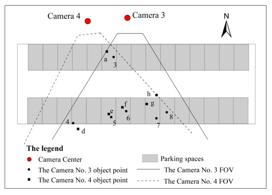 After object detection and mapping for each camera in the two experimental areas, the object optimization was performed based on the OS-CDD algorithm. Figure 13 shows the objects in the overlapping FOVs of Cameras 1 and 2 in the office scene. The five objects detected by Camera 1 are listed as a, b, c, d, and e. The five objects detected by Camera 2 are numbered 3, 4, 5, 6, and 7. Meanwhile, Figure 14 shows the objects in the overlapping FOVs of Cameras 3 and 4 in the parking lot. The six objects detected by Camera 3 are numbered 3, 4, 5, 6, 7, and 8, while the six objects detected by Camera 4 are listed as a, d, e, f, g, and h.
