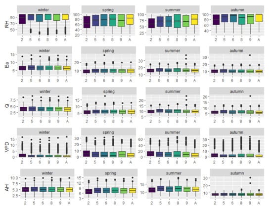 Seasonal distribution of mean values of humidity parameters (RH, Ea, Q, VPD, and AH) are presented in Figure 3. Mean seasonal RH values are the lowest in LCZ 2, and the highest in LCZ A in all seasons. The other urban LCZs (5, 6, 8, and 9) exhibit relatively similar mean values in winter and summer, and relatively small differences in spring (9 < 5 < 6 < 8) and autumn (8 < 5 < 9 < 6). In all seasons, RH values exhibit wide ranges (up to 40%), except for the winter season, when the ranges are narrower, but certain outliers are observed in LCZs 5, 6, 8, 9, and A. Yang et al. [4] also reported no significant seasonal variations for RH.