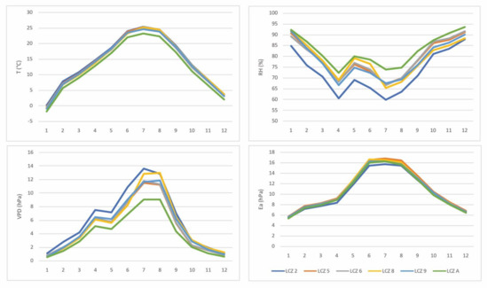 Monthly averages (December 2015–December 2017) of air temperature and humidity parameters (RH, VPD; Ea) in LCZs of Novi Sad. NOTE: Full Figure S4 (with AH and Q values) can be found in Supplementary Materials.
