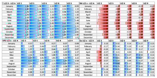 Monthly mean differences in air temperature and humidity parameters (RH, VPD, and Ea) between urban LCZs (2, 5, 6, 8, and 9) and rural LCZ A (positive difference—blue, negative difference—red). NOTE: Full Figure S5 (with AH and Q values) can be found in Supplementary Materials.
