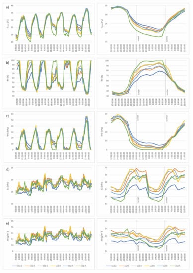 VPD shows very low values in the CW period, ranging from 0 to 2.5 hPa. A somewhat clearer pattern is noticed observing hourly averaged values during the CW. In the nighttime, VPD values are very low, just above 0 (0.4–1 hPa), and during the daytime, the VPD increases up to 1.6 hPa at 3 h before the sunset. The highest VPD is observed in LCZ 2, and the lowest in LCZ A.