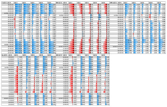 Air humidity conditions vary significantly throughout the day, and therefore the form and intensity of UDI could express large daily variations [1]. Hourly differences in air temperature and air humidity parameters during the extreme events, HW and CW, are analyzed. Figure 6 shows hourly differences in Ta, RH, Ea, VPD, and AH during HW (20–25 June 2017).