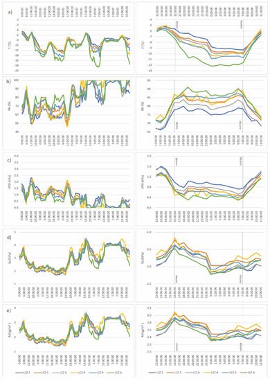 Figure 8 shows dynamics of air temperature, relative humidity, atmospheric water vapor pressure, vapor pressure deficit, and absolute humidity differences during the cold wave (6–12 January 2017).