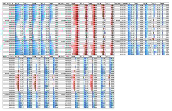 Figure 7 shows hourly differences in air temperature and humidity parameters (RH, Ea, VPD, and AH) between urban LCZs (2, 5, 6, 8, and 9) and rural LCZ during the HW.