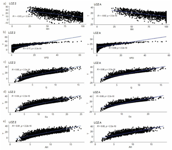 Previous analysis has shown that air temperature might affect humidity parameters. For that reason, we conducted more detailed analysis to assess the relationship between air temperature and humidity parameters. We used mean values of the two-year data (December 2015–December 2017) for RH, VPD, Q, Ea, and AH for one urban (LCZ 2) and natural LCZ (LCZ A), which exhibited major differences in previous analysis. The results are presented in Figure 10.