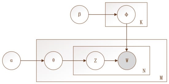 LDA is a three-level hierarchical Bayesian model, which introduces the concept of a topic into a document–word matrix, then extends it to the combination of a document–topic probability matrix and a topic–word probability matrix. This model is based on the theory that similar words may belong to the same topic [35]. It assumes that a document is composed of multiple topics, and each topic is characterized by a distribution over words; that is, topics are latent. The framework of the LDA topic model is presented in Figure 1, where the box implies the number of repeated sampling steps, M represents the number of documents in the corpus, K represents the number of given topics, the number of words in the vocabulary list is denoted by N, and Z means the potential topics of the only observable words W. The LDA model chooses the topic for each document from the document–topic probability distribution θ (with size M × K; α is the hyperparameter of the Dirichlet prior distribution for the topic distribution underlying each document), then chooses the words under each topic from the topic–word probability distribution φ (with size K × N; β is the hyperparameter of the Dirichlet prior distribution for the word distribution under each topic), in order to generate the document.