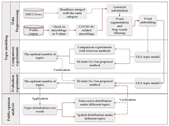 Wuhan city, which belongs to Hubei province, is one of the regions most severely affected during the early days of the COVID-19 outbreak. Analyzing public opinion within the city is helpful to understand the status of the epidemic in this region and the public opinion trend, which has important guiding significance for differentiated epidemic prevention and control in the future. We first evaluated the validity of the proposed method, which can be used to choose the optimal number of topics. After that, we carried out the topic mining experiment based on the real case study, analyzing the spatio-temporal distribution characteristics of different topics under the optimal classification results. The overall workflow of our experiments is shown in Figure 2. The CPU used in our experiment was an 11th Gen Intel(R) Core (TM) i5-1135G7 CPU @ 2.40 GHz and the memory was 16.0 GB of RAM. The LDA model was conducted with the scikit-learn Python module [39]. It should be noted that the largest part of our experiment was realized in Python language, except for the comparison results of four methods mentioned in Section 3.2, which were performed in R language.