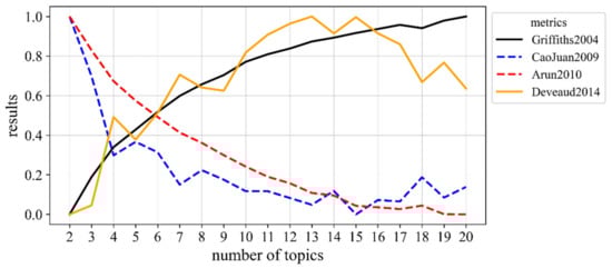A smaller number of topics leads to indistinguishable overlap between topics, while a larger number generates overly specific topics; thus, each topic may contain less information. The number of topics is a crucial parameter for the LDA model. In order to determine this parameter, scholars have proposed a variety of methods to evaluate the optimal number of topics. This paper does not repeat the basic methods, such as the perplexity approach, but mainly describes the following four evaluation methods that were commonly employed in recent works [27,37,38]. K denotes the number of topics in the rest of this section.