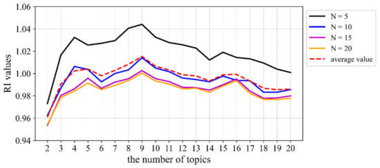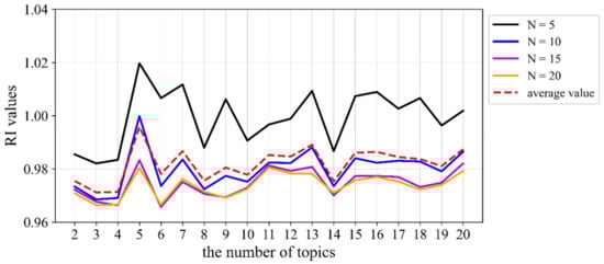 where the cos_sim() function in Equations (8) and (9) represents the cosine similarity between two vectors, which is normalized between 0 and 1; Wki represents the word vector of the ith word under topic k in the T–W matrix; Si represents the sentence vector composed of the words under the ith topic. As a topic generated by LDA is composed of words, the number of words—denoted by N—will affect the classification result. It is necessary to calculate the value of RI under different values of N, finally taking the mean value as the index value to choose the optimal number of topics. A larger value of RI implies a better topic structure.