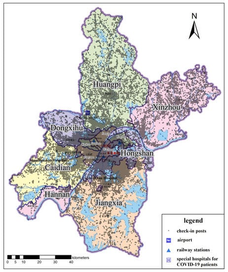 The study area used in this paper includes 13 municipal districts of Wuhan, including Wuchang District, Hongshan District, and so on. The basic approach to obtain check-in data in Weibo is to use web crawler technology to capture the posts on the check-in webpage. Due to a permission limitation, users can only query the real-time check-in posts of about 20 pages of a certain place, which means that we could not crawl the historical records from this webpage, and the number of posts that we were able to crawl was limited. According to the user pool with 20 million active domestic and overseas users established by Yong Hu et al. [42], the authors crawled all posts of every user on Weibo and built a rich Weibo corpus. Based on the Weibo corpus provided by Yong Hu et al. [43], we filtered the check-in data with a location in Wuhan before and after the COVID-19 outbreak period in Wuhan; that is, from December 2019 to April 2020. The available attributes of data included: posting time, location (marked as latitude and longitude), and text. The daily number of confirmed cases in Wuhan was collected from the website of DingXiangYuan [44], among which the data of confirmed cases in December 2019 came from laboratory-confirmed data provided in the literature [45]. The maps of Wuhan city, with basic elements and administrative areas, were obtained from the map world website. Considering the significant landmarks during the COVID-19 epidemic, we added three railway stations, Wuhan airport, and two special hospitals (Huoshenshan and Leishenshan) as data sources (Figure 5).