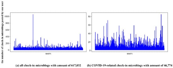 We first transformed the coordinates of the obtained check-in posts on Weibo in order to unify the coordinate system. Then, we extracted the check-in data in Wuhan, according to the spatial scope, and 617,032 check-in posts produced by 124,281 users were obtained. Some instances of this dataset were presented in Table 3. The posts distribution among the users is demonstrated by Figure 6a, from which we could discover several non-human contributors combined with text content. Sina Weibo users can share text messages limited to 140 characters, as well as non-text messages such as pictures and videos. The extraction process of text messages, pictures, videos, and other information will produce redundant text. In addition, hashtags and main text content will be inconsistent due to advertising and marketing. Therefore, this kind of text needed to be filtered. In general, text filtering includes the removal of interfering information, such as the names of the check-in places, links, @ symbols, pictures, videos, and hashtags. The initial filtered check-in text was screened, according to 179 epidemic-related keywords, such as “COVID-19”, “pneumonia”, “Cov-19”, and “COVID-19” [43], after which 46,837 COVID-19-related posts were obtained. In order to carry out topic mining and reduce the interference of synonyms, word segmentation and stop word filtering were carried out and, after that, we filtered out the words with high frequency, such as “Wuhan”, “epidemic”, and “fighting”. With reference to [21], synonym substitution was carried out (e.g., “Wuhan city” was replaced with “Wuhan”, which both mean “Wuhan”) and, finally, 46,774 non-empty posts produced by 22,733 users were obtained. The posts’ distribution among the users is demonstrated by Figure 6b, from which we could figure out that there were no non-human contributors combined with the text content. The characteristics of the datasets were shown in Table 4.
