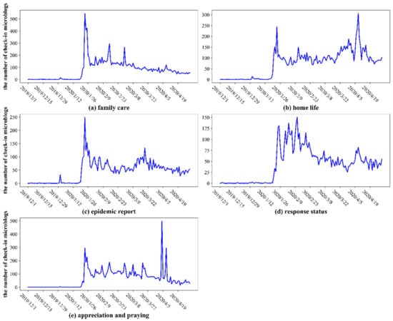 As a result, we divided the epidemic-related check-in microblog corpus into five categories. The words that were used to describe each topic and the number of microblogs in each category are provided in Table 5. “Family care” refers to the public’s concern and sympathy for their family and friends during the epidemic, and depicts the state of getting along with family members. “Home life” includes people’s comments on community life and attention to commuting and traffic conditions. “Epidemic report” refers to reports of newly confirmed cases and other statistical data during the COVID-19 pandemic on Weibo, or objective comments on the status of confirmed cases. “Response status” refers to public concern about the current situation of the COVID-19-related response and treatment, including hospital capacity for nucleic acid testing, patient infection status, and community isolation. “Appreciation and praying” refers to the public’s appreciation for frontline medical workers, blessings to the people of Wuhan, praise for those who prevent and control the epidemic, and hope for an early victory in epidemic prevention and control.