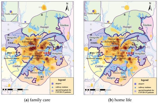 Figure 8 shows the kernel density estimation results based on the check-in microblogs related to the epidemic. As the visual results show, the hot-spots of check-in microblogs were mainly distributed in the center of the main urban area of Wuhan city. In addition, there were other hot-spots scattered in the municipal districts around Wuhan (Huangpi District, Xinzhou District, Dongxihu District, Caidian District, Hannan District, and so on), as well as Tianhe Airport. The hot-spots of check-in microblogs in municipal districts were mainly distributed in residential areas. This was due to more densely populated places having more users on Weibo and, thus, more posts with fine-grained geo-tags (i.e., check-in microblogs) were uploaded. As the traffic main artery access to Wuhan, Tianhe airport and the three major railway stations had a relatively dense floating population during the period of non-lockdown, thus, also making them check-in hot-spots on Weibo.