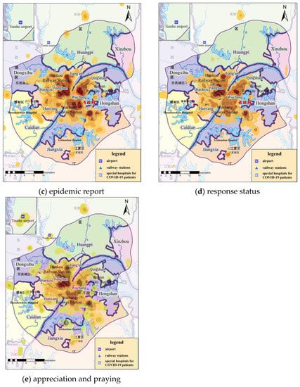 The popularity of “epidemic report” and “response status” topics near Tianhe Airport was relatively low. Considering the time-series results, this was partly due to the heated discussion of these two topics, which mainly occurred over the lockdown period, as the airport was located in the outskirts without a large residential area nearby. The other topic, “epidemic report”, is mainly a statement of objective facts, so it was relatively evenly distributed in residential areas on both sides of the Yangtze River. “Response status” is closely related to medical resources, so hot-spots of public opinion appeared near both Huoshenshan Hospital and Leishenshan Hospital.