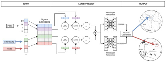 The process workflow is divided into three steps: (i) toponym transformation to character n-grams; (ii) latitude-longitude prediction using a recurrent neural network architecture; (iii) reprojecting output coordinates into the WGS84 (https://fr.wikipedia.org/wiki/WGS_84 (accessed on 28 November 2021)) coordinate system.