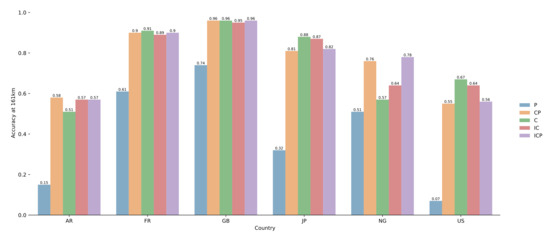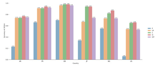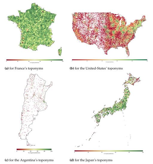 Our model trained with toponyms for different countries performs well except for the United States. In order to investigate this issue, we first produce prediction maps like the ones in Figure 11a,b. The aim is to reveal regions where our model performed well and where it has not. For producing these maps, we use the “per pair” experimental results and we associate each pair and its predicted coordinates with an hexagon cell using the H3 grid system. Finally, we compute, for each cell, the percentage of predictions that were correctly made (with a distance less than 161 km). Four countries covering the different types of results were selected: France, United States, Argentina and Japan. We observe in Figure 11a,d that predictions for pairs over France and Japan are mainly accurate, except for small areas (on the south west of France or the north of Japan). Places in these areas are sparse, which may explain the results. Figure 11b shows that for the US many areas are badly predicted by our model, mainly covering the West and South regions. Same as in France or Japan, places in these areas are more sparse. This is different from the North-East, where the model performed well around major US cities like New-York, Philadelphia, or Chicago. Therefore, one possible reason for the worse performance lies in place sparsity (at least in the dataset used in our tests). This is something we can also highlight for Argentina, as illustrated in Figure 11c.