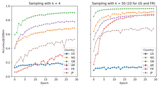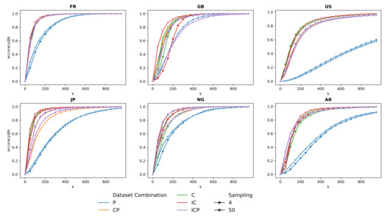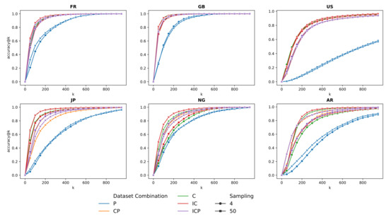 Figure 7 and Figure 8 show the results obtained with models trained with different sampling parameters. Figure 9 shows the accuracy@k curve for each geographical scope, sampling strategy, and dataset combination. Following the same trends as in the per pair geocoding experiments, with a sampling threshold value of 4, co-occurrence-only models obtain a high accuracy except for Nigeria and Argentina, where the addition of pairs from proximity and inclusion relationships improves the model accuracy. Unlike models trained with datasets with a lower sampling, a higher sampling causes the co-occurrence-only model to obtain the highest accuracy for every country, even Argentina and Nigeria. In a similar way, proximity-only trained models mostly obtain the lowest accuracy. As illustrated in Figure 9, these models only obtain high accuracies with a high value for k. Finally, there is no significant improvement in the highest accuracy between models trained with datasets with a different sampling.