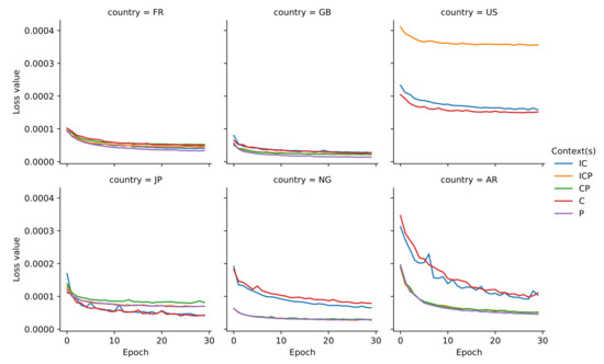 In a first experiment, we evaluate the geocoding accuracy of the model on pairs of toponyms. In order to replicate real-world requests on the model, we use pairs extracted from co-occurrences of places in Wikipedia. Figure 3 and Figure 4 show the results obtained considering different sampling strategies. Figure 5 shows the accuracy@k curve for each geographical scope, sampling, and dataset combination. We observe that models trained with pairs from the proximity-only dataset obtain the lowest accuracy. Furthermore, as shown on Figure 5, to obtain a high accuracy, the threshold value k needs to be high compared to other models. Focusing on the results obtained with a lower sampling (i.e., 4), our model shows high accuracies except for the US (Figure 3). Furthermore, models trained with only co-occurrences achieve the highest accuracies for some countries such as France (0.91), Great Britain (0.96), Japan (0.88), and the US (0.67). However, for countries like Argentina and Nigeria, co-occurrences are not enough and, for those, the addition of pairs from proximity and inclusion relationships increases the accuracy of the model. For instance, there is a 19% difference between the CP (co-occurrences + proximity) and C (co-occurrence only) models for Nigeria. We observe that pairs from proximity relationships increase the accuracy of some models, mostly for countries with less data. Table 1 highlights the difference between the number of co-occurrence pairs between France (376,088) and Nigeria (5638). A same observation can be made on the evolution of the loss value in Figure 6 where values for co-occurrence only model are higher than those for the other models with the combination of proximity and co-occurrences.
